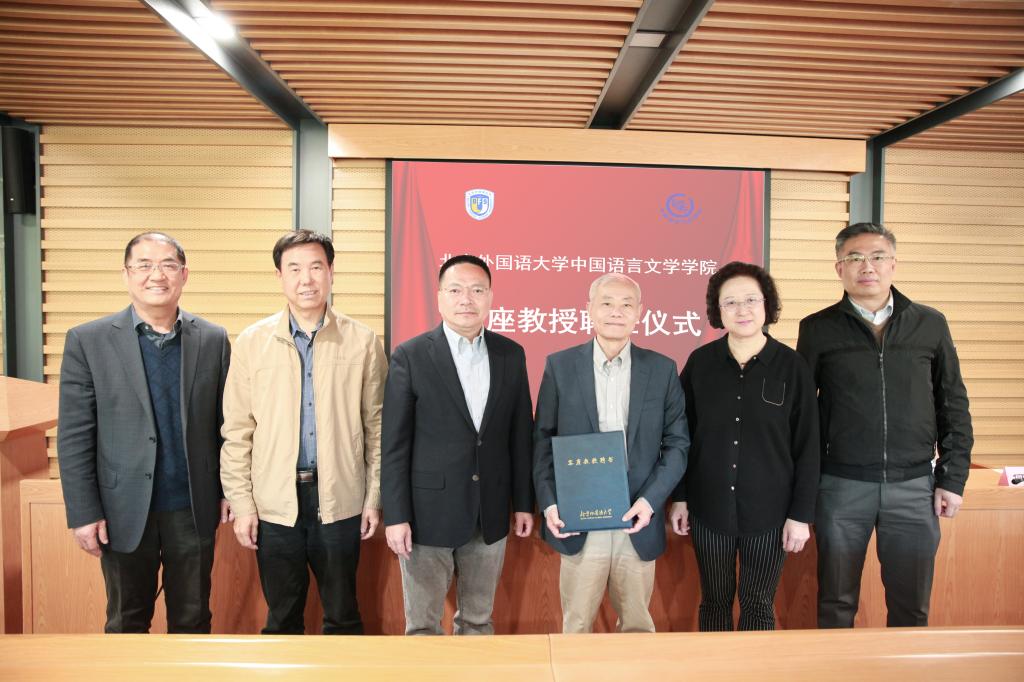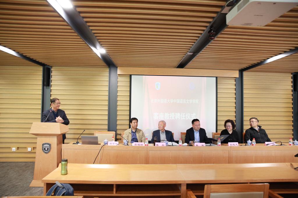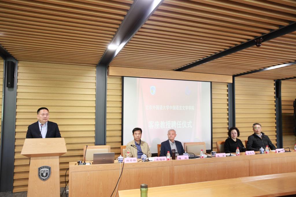 2021年4月13日下午,北京大学中文系博雅特聘教授傅刚先生客座教授聘任仪式暨学术报告会在北外图书馆三楼报告厅举行。出席本次聘任仪式及报告会的领导有beat365中文官方网站校学术委员会主任袁军教授、beat365中文官方网站党总支书记何辉、院长詹福瑞、执行院长张晓慧等。聘任仪式及讲座由beat365中文官方网站学术委员会主任魏崇新教授主持。