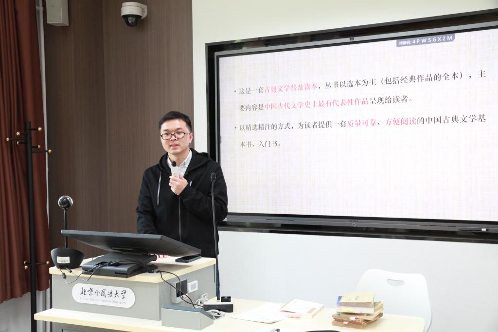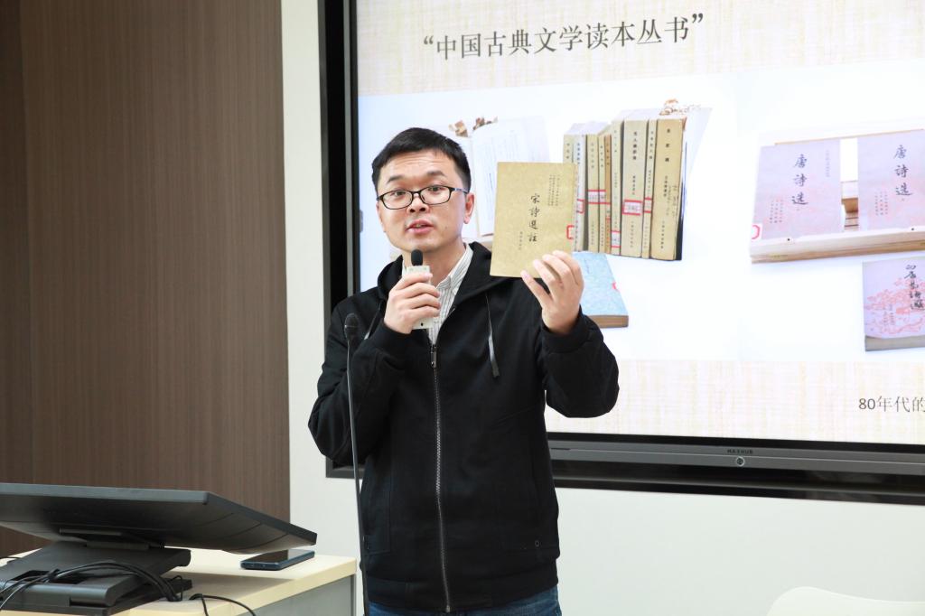 2023年4月12日下午,beat365中文官方网站中国古代文学研究所第4期学术沙龙在beat365中文官方网站中文楼219教室举行。人民文学出版社李俊编审带来“当代古典诗词选本的演进脉络——以‘中国古典文学读本丛书’为例”的主题分享。中文系主任、研究所副所长徐晓峰主持本次沙龙,研究所教师蒋文燕、周健强、罗静、青子文、吴娟,古代文学专业硕士研究生以及部分本科生出席并参与讨论。