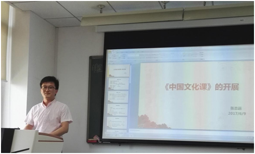 6月9日下午1:30,培训中心进修部选修课课程组交流分享会在本学院420教室召开,会议主题为中国文化课教学环节展示,主讲人为张志远老师。会议内容从课前准备、具体授课安排、中西文化对比、课后反思等几大模块展开说明,进行了一系列精彩授课环节展示。