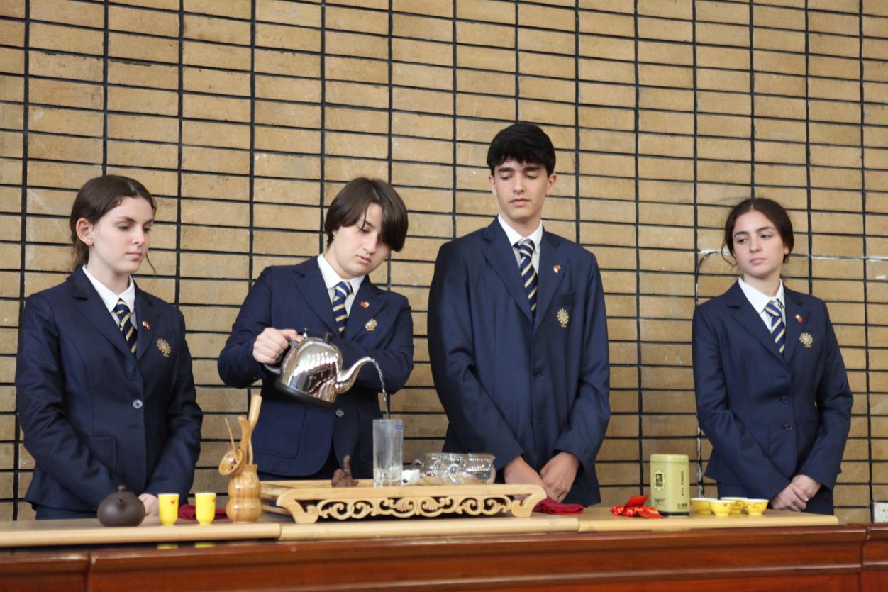 接着是高二年级茶艺展示,伴随着古筝曲《渔舟唱晚》,文化厅飘来阵阵茶香,罗马同学的泡茶技术娴熟,泡茶环节有条不紊的进行,以举一动都散发出端庄典雅的姿态,泡好茶后由学生端给张晓慧老师品茶。
