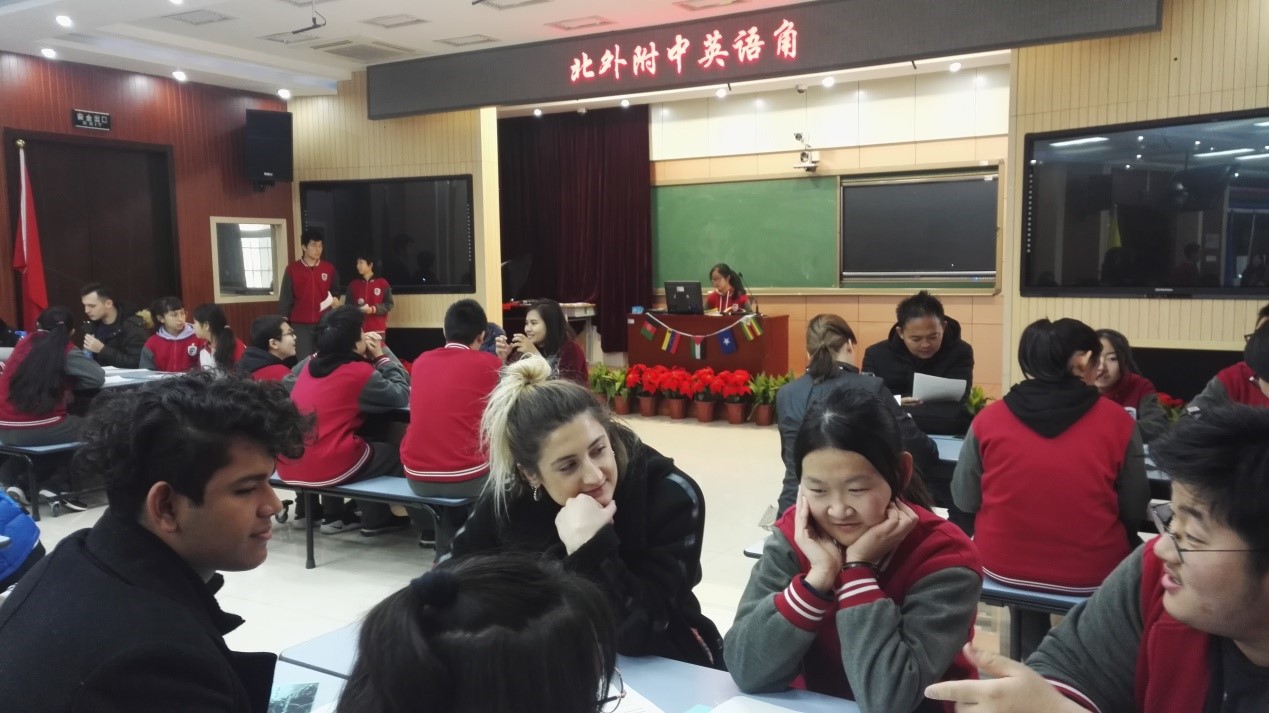 12月14日下午,汉语培训中心十余人留学生代表,应邀参加北外附中英语角活动,活动主题为“My favorite Hero”,附中初中部和高中部90余名学生参加了此次活动。