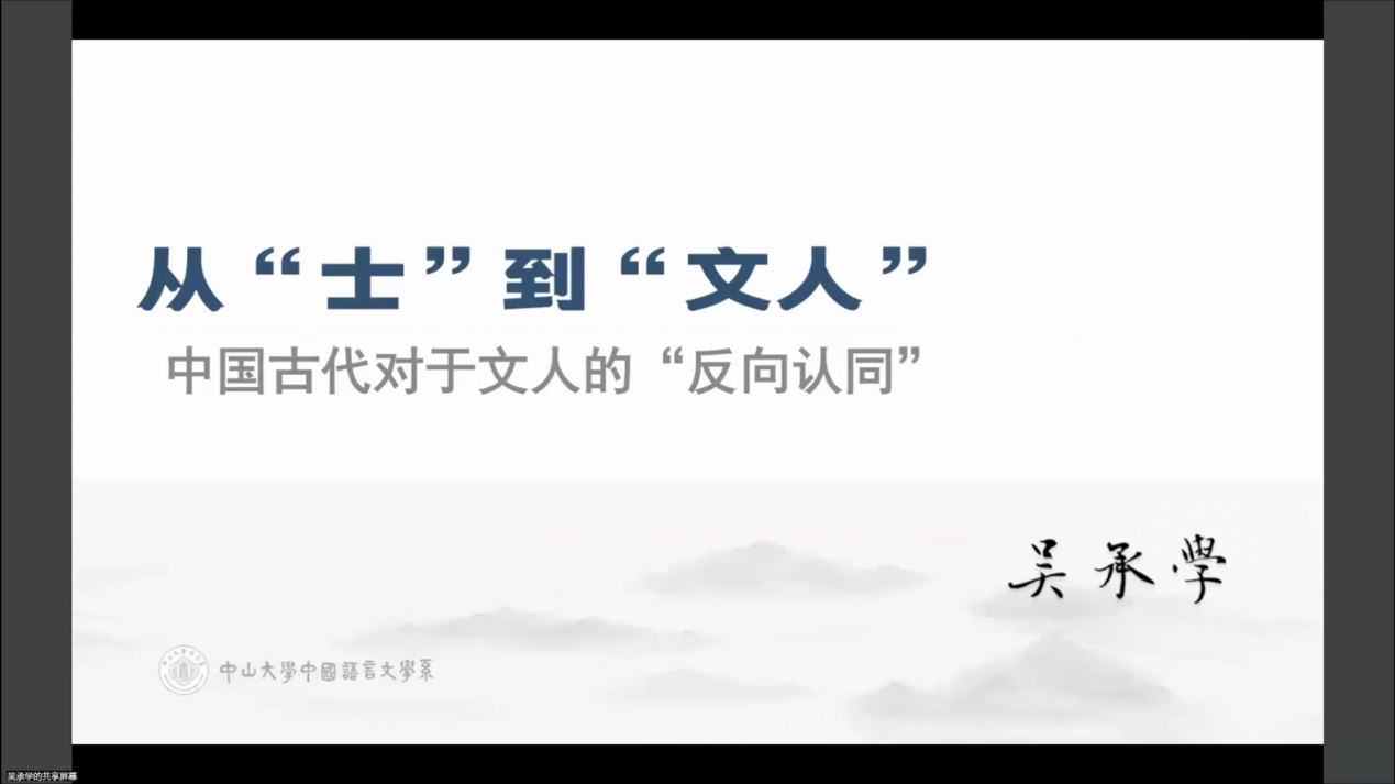 2022年12月7日下午,中山大学中文系教授、博士生导师、中山大学“逸仙学者”讲座教授、教育部“长江学者特聘教授”吴承学先生应邀做客“北外文华讲堂”,以线上方式作了题为《从“士”到“文人”——中国古代对于文人的“反向认同”》的报告。报告由北外beat365中文官方网站学术委员会主任魏崇新主持,beat365中文官方网站院长詹福瑞、副院长方稚松以及学院师生共一百余人参与。