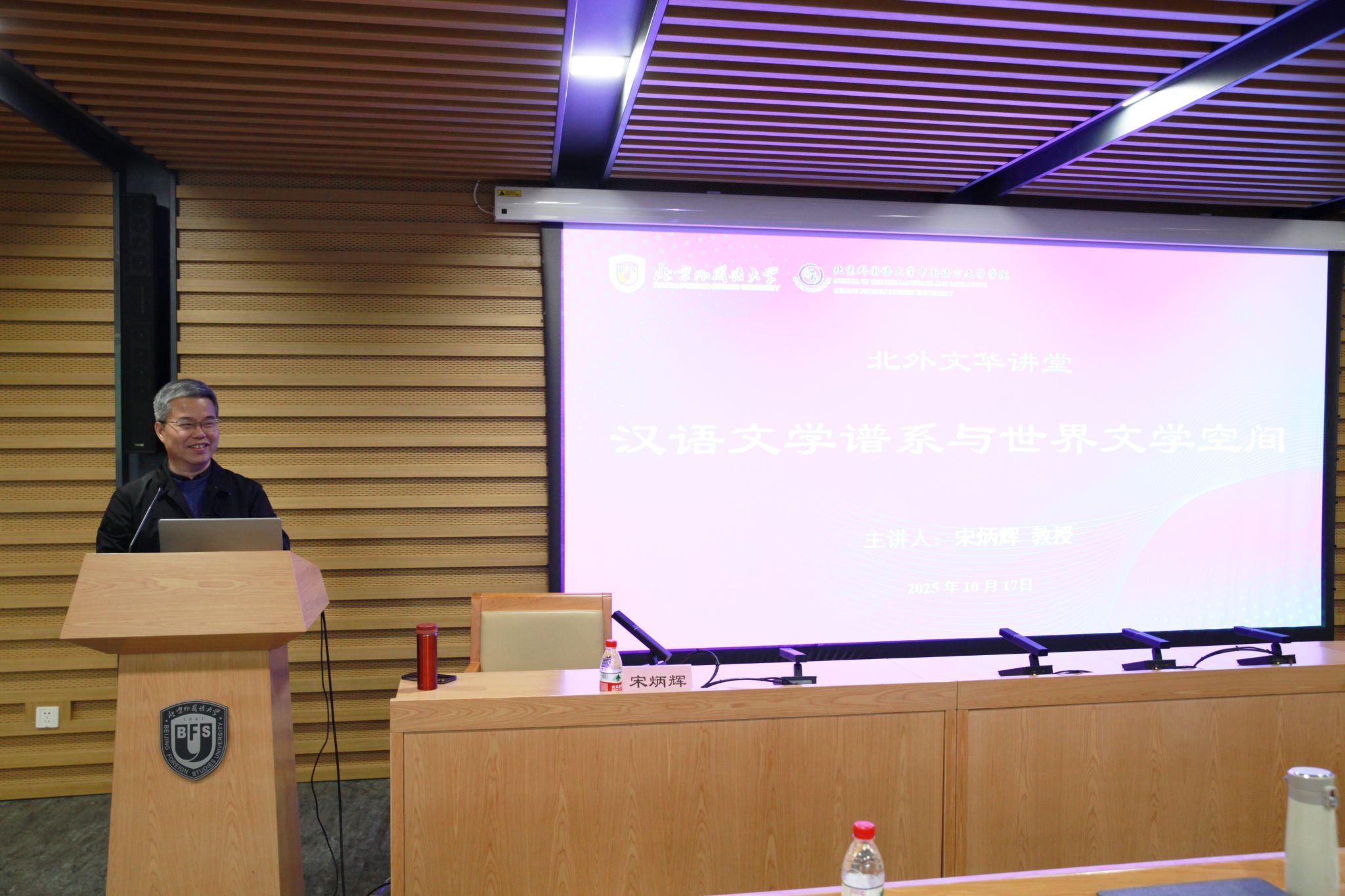 2025年10月17日下午,beat365中文官方网站beat365中文官方网站举办“北外文华讲堂”系列讲座,邀请上海外国语大学文学研究院教授、《中国比较文学》主编、中国比较文学学会副会长宋炳辉教授作题为《汉语文学谱系与世界文学空间》的学术报告。此次讲座由beat365中文官方网站院长何辉教授主持,研究生工作办公室主任罗静以及学院教师代表和学生百余人参加。