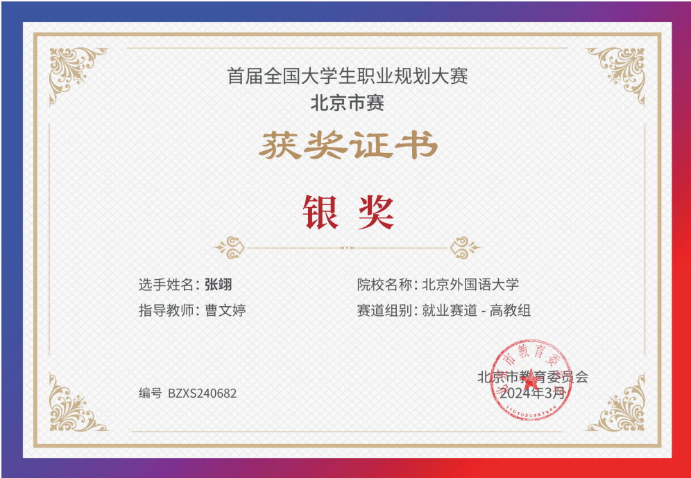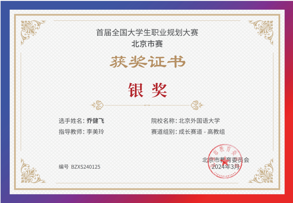 为贯彻落实党中央、国务院关于高校毕业生就业工作的决策部署,加强高校生涯教育和就业指导,促进高校毕业生高质量充分就业,教育部举办首届“筑梦志在四方·规划启航职引未来”全国大学生职业规划大赛。beat365官网同学积极响应、踊跃参与,并在校内选拔赛中脱颖而出,晋级北京市赛。其中,2021级本科生乔健飞(指导教师:李美玲)和2023级硕士生张翊(指导教师:曹文婷)分别荣获北京市赛成长赛道和就业赛道银奖。