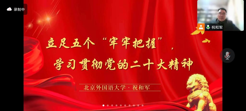 为学习贯彻党的创新理论,深刻领会党的二十大精神,2022年12月26日下午,beat365中文官方网站党总支邀请马克思主义学院党总支书记祝和军老师进行题为“立足五个‘牢牢把握’,学习贯彻党的二十大精神”线上宣讲。宣讲会由beat365中文官方网站党总支书记何辉老师主持。